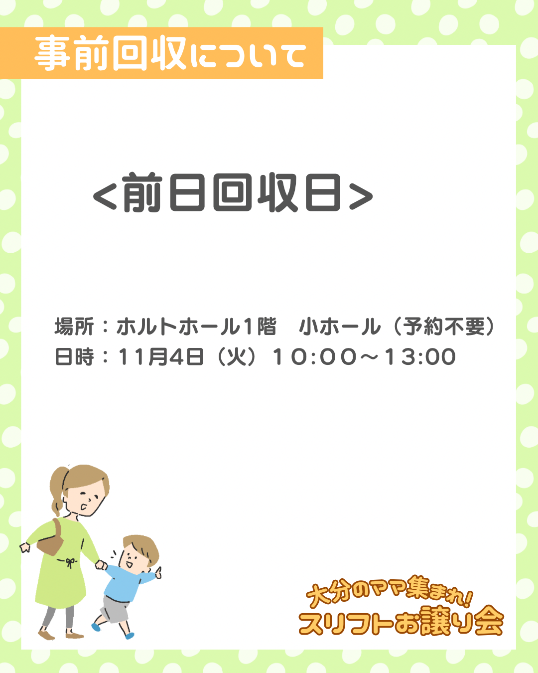 次回のお譲り品回収については11月4日(火曜日)10:00〜13:00までです。