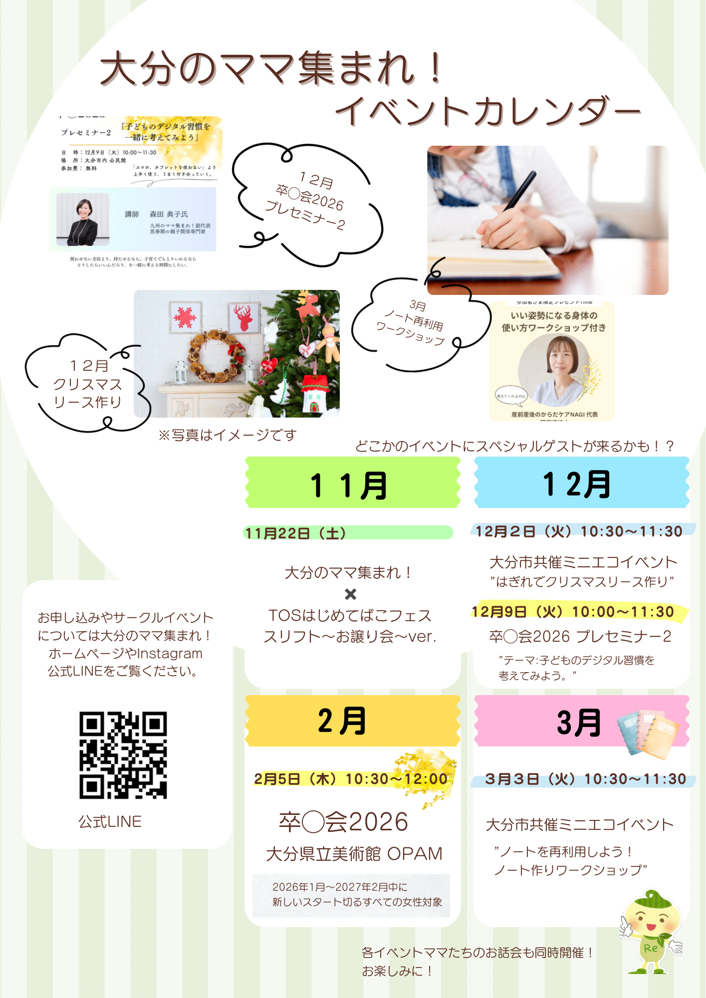 今年もあと11月・12月を残すのみ。この2ヶ月も大分のママ集まれ!イベント盛りだくさん❤︎たくさんのママと会えることスタッフとても楽しみです♩