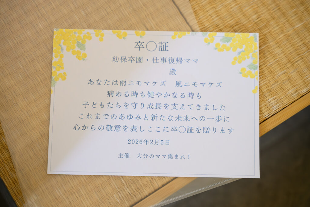 イベントの締めくくりとして行われた「卒〇証授与」は、参加者一人ひとりが歩んできた子育ての日々にそっと光を当て、その積み重ねをあたたかく称えるひとときとなりました。これまでの努力や想いが言葉として形になることで、「これからの自分」へと目を向ける前向きな気持ちが広がっていきました。