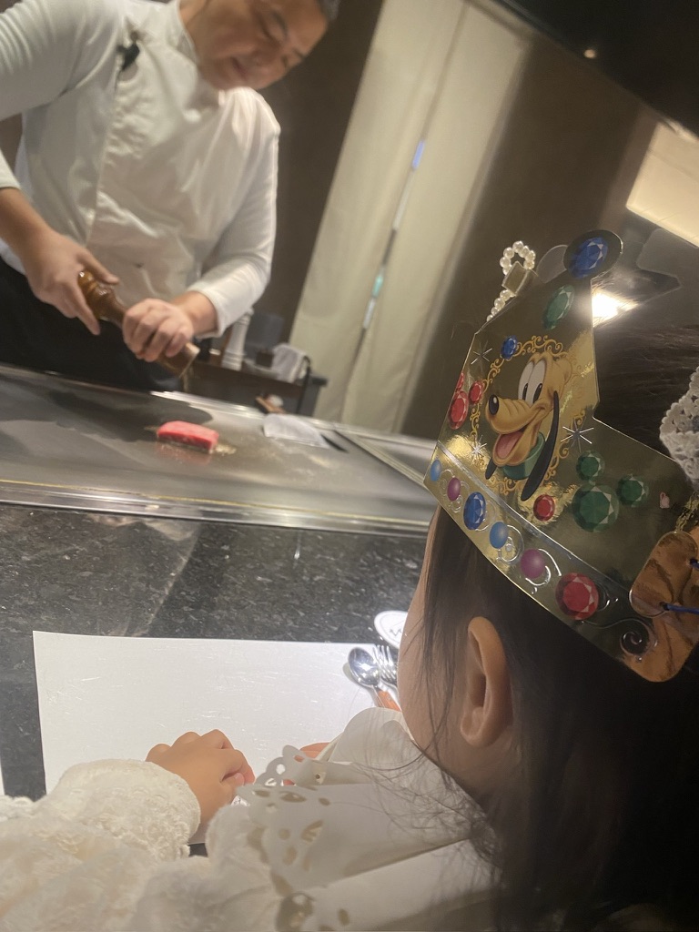 モダンな鉄板焼きレストランの「お食い初めプラン」の文字。